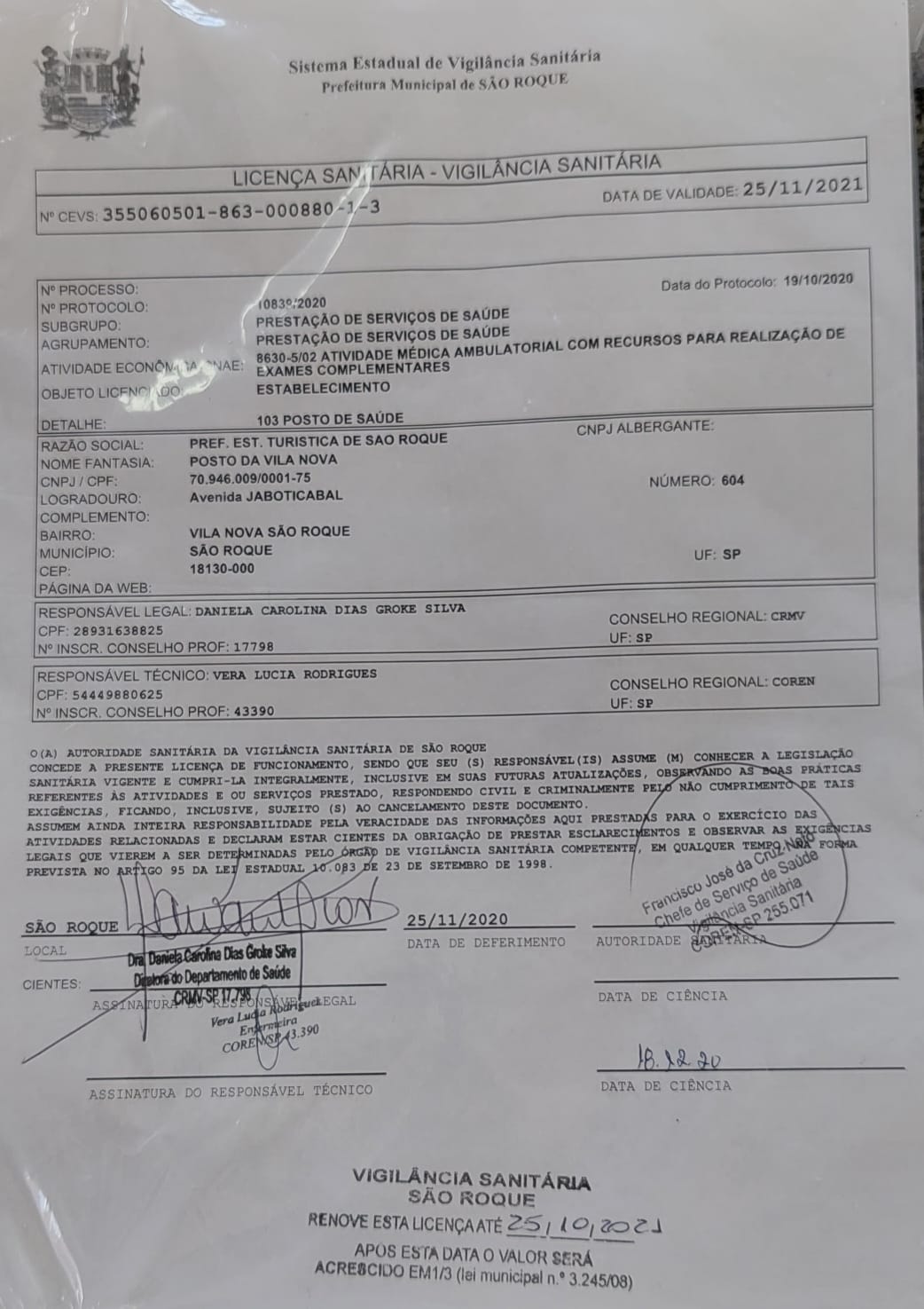 Assunto: Solicito ao departamento de saúde informações a respeito do porque das licenças sanitárias das unidades de saúde vencidas a quase 3 meses